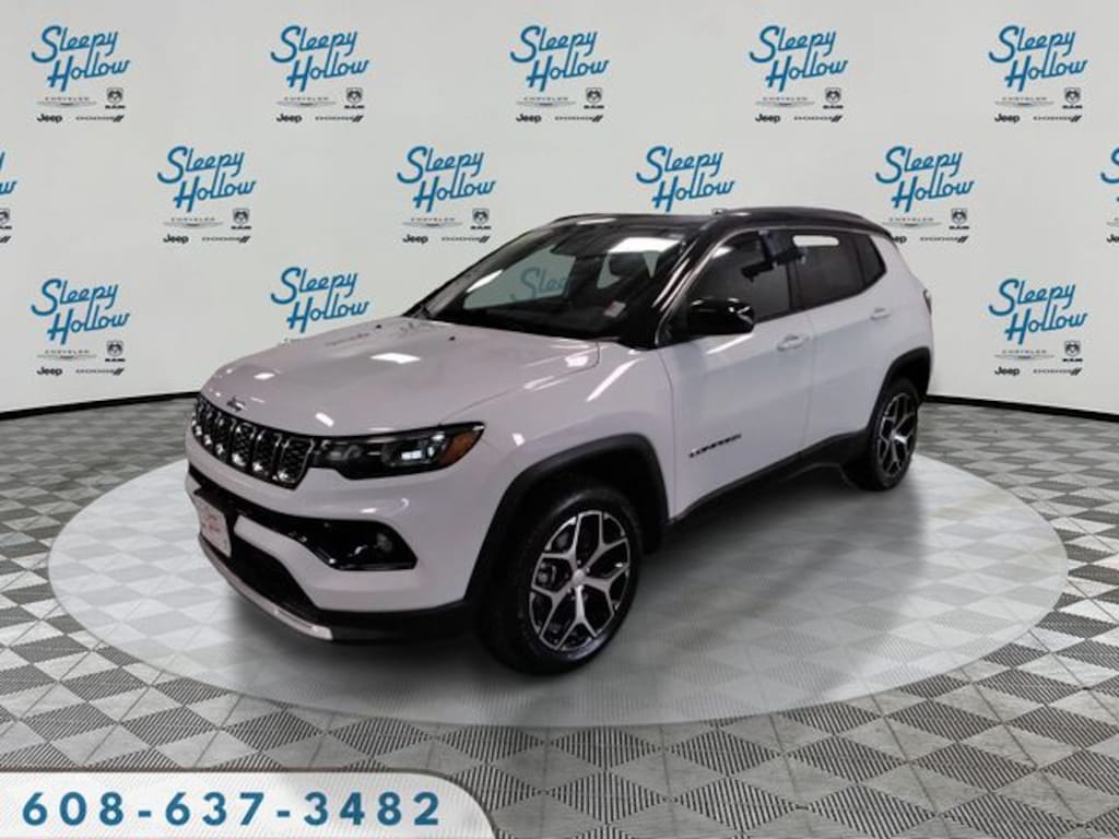 Bright White Clearcoat 2024 Jeep Compass Limited 4WD 8-Speed Automatic 2.0L I4 DOHC 4WD, 10.1" Touchscreen Display, 3.73 Final Drive Ratio, 4-Wheel Disc Brakes, 4G LTE Wi-Fi Hot Spot, 6 Speakers, ABS brakes, Air Conditioning, Alloy wheels, AM/FM radio: SiriusXM, Auto High-beam Headlights, Auto-dimming Rear-View mirror, Automatic temperature control, Brake assist, Bumpers: body-color, Compass, Delay-off headlights, Disassociated Touchscreen Display, Driver door bin, Driver vanity mirror, Dual front impact airbags, Dual front side impact airbags, Electronic Stability Control, Emergency communication system: Jeep Connect, For Details, Visit DriveUconnect.com, For More Info, Call 800-643-2112, Four wheel independent suspension, Front anti-roll bar, Front Bucket Seats, Front Center Armrest w/Storage, Front dual zone A/C, Front fog lights, Front reading lights, Fully automatic headlights, Global Telematics Box Module (TBM), Heated door mirrors, Heated front seats, Heated steering wheel, Illuminated entry, Knee airbag, Leather Shift Knob, Leather steering wheel, Leatherette Seats, Low tire pressure warning, Occupant sensing airbag, Outside temperature display, Overhead airbag, Overhead console, Panic alarm, ParkView Rear Back-Up Camera, Passenger door bin, Passenger vanity mirror, Power door mirrors, Power driver seat, Power Front/Fixed Rear Full Sunroof, Power steering, Power windows, Premium Alpine Speaker System, Quick Order Package 29G Limited, Radio: Uconnect 5 w/10.1" Display, Rain sensing wipers, Rear anti-roll bar, Rear seat center armrest, Rear window defroster, Rear window wiper, Remote keyless entry, Security system, SiriusXM Guardian - Included Trial (B), SiriusXM Radio Service, Speed control, Split folding rear seat, Spoiler, Steering wheel mounted audio controls, Sun and Sound Group, Tachometer, Telescoping steering wheel, Tilt steering wheel, Traction control, Trip computer, Turn signal indicator mirrors, Variably intermittent wipers, Wheels: 18" x 7" Painted Diamond Cut Aluminum, 4WD.