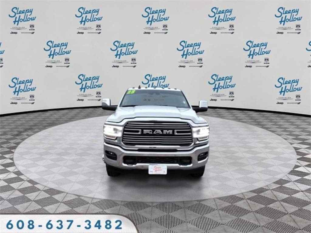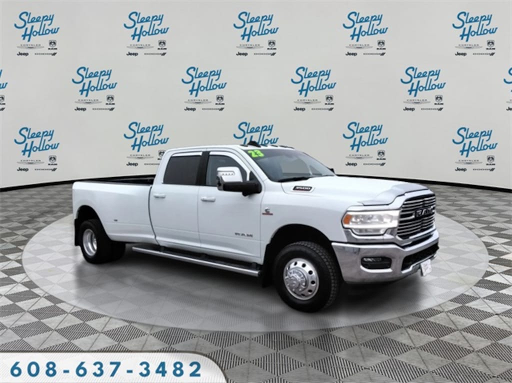 Bright White Clearcoat 2023 Ram 3500 Laramie 4WD 6-Speed Automatic Cummins 6.7L I6 Turbodiesel 10 Speakers, 115V Auxiliary Rear Power Outlet, 12" Touchscreen Display, 17 Speaker harman kardon Premium Sound, 2 Way Rear Headrest Seat, 220 Amp Alternator, 2nd Row In Floor Storage Bins, 3.73 Axle Ratio, 4 Way Front Headrests, 4-Wheel Disc Brakes, 4G LTE Wi-Fi Hot Spot, 50 Gallon Fuel Tank, 5th Wheel/Gooseneck Towing Prep Group, 6000# Front Axle w/Hub Ext, ABS brakes, Active Noise Control System, Adaptive Cruise Control w/Stop, Adaptive Steering System, Air Conditioning, Alexa Built-In, Alloy wheels, AM/FM radio: SiriusXM with 360L, Apple CarPlay, Apple CarPlay/Android Auto, Auto Adjust In Reverse Exterior Mirrors, Auto Dim Exterior Mirror, Auto Dimming Exterior Passenger Mirror, Auto High Beam Headlamp Control, Auto Level Rear Air Suspension, Auto Power-Folding Mirrors, Auto-dimming Rear-View mirror, Automatic temperature control, Bed Utility Group, Blind Spot & Cross Path Detection, Box & Rear Fender Clearance Lamps, Brake assist, Bright Front Bumper, Bright Rear Bumper, Bumpers: body-color, Center Hub, Chrome Bumper Package, Chrome Exterior Mirrors, Clearance Lamps, Cold Weather Group, Compass, Connected Travel & Traffic Services, Connectivity - US/Canada, CTR Stop Lamp w/Cargo View Camera, Delay-off headlights, Disassociated Touchscreen Display, Driver door bin, Driver vanity mirror, Dual front impact airbags, Dual front side impact airbags, Dual Rear Wheels, Electronic Stability Control, Electronically Controlled Throttle, Emergency Vehicle Alert System (EVAS), Engine Block Heater, Exterior Mirrors Courtesy Lamps, Exterior Mirrors w/Heating Element, Exterior Mirrors w/Memory, Exterior Mirrors w/Supplemental Signals, Foam Bottle Insert (Door Trim Panel), Folding Flat Load Floor Storage, For Details Visit DriveUconnect.com, For More Info, Call 800-643-2112, Forward & Reverse Utility Lights, Front anti-roll bar, Front Center Armrest w/Storage, Front dual zone A/C, Front LED Fog Lamps, Front License Plate Bracket, Front reading lights, Front Seat Back Map Pockets, Full Speed Forward Collision Warning Plus, Fully automatic headlights, Garage door transmitter, Global Telematics Box Module (TBM), Google Android Auto, GPS Antenna Input, GPS Navigation, HD Radio, Heated door mirrors, Heated Front Seats, Heated front seats, Heated Second Row Seats, Heated Steering Wheel, Heated steering wheel, Heavy Duty Snow Plow Prep Group, High Back Seats, Illuminated entry, Integrated Voice Command w/Bluetooth, Lane Keep Assist, Laramie Level F Equipment Group, Leather steering wheel, Leather Trim 40/20/40 Bench Seat, LED Bed Lighting, LED Reflector Headlamps, Low tire pressure warning, Manufacturer's Statement of Origin, Mirror Running Lights, MOPAR Deployable Bed Step, MOPAR Front & Rear Rubber Floor Mats, MOPAR Spray In Bedliner, MOPAR Winter Front Grille Cover, Navigation System, Occupant sensing airbag, Off-Road Information Pages, Outside temperature display, Overhead airbag, Overhead console, Panic alarm, ParkSense Front/Rear Park Assist System, ParkView Rear Back-Up Camera, Passenger door bin, Passenger vanity mirror, Power 8-Way Adjustable Passenger Seat, Power Adjust 8-Way Driver Seat, Power Adjust Mirrors, Power Adjustable Pedals w/Memory, Power door mirrors, Power driver seat, Power Heat Fold Memory Telescopic Mirrors, Power passenger seat, Power steering, Power Sunroof, Power Telescoping Mirrors, Power windows, Power-Adjustable Convex Aux Mirrors, Protection Group, Quick Order Package 2HH Laramie, Radio data system, Radio: Uconnect 5 Nav w/12.0" Display, Radio: Uconnect 5 Nav w/8.4" Display, Rain Sensitive Windshield Wipers, Rear 60/40 Folding Seat, Rear Power Sliding Window, Rear reading lights, Rear seat center armrest, Rear step bumper, Rear Window Defroster, Remote keyless entry, Remote Tailgate Release, Safety Group, Security system, Selectable Tire Fill Alert, SiriusXM Radio Service, SiriusXM w/360L, Speed control, Split folding re