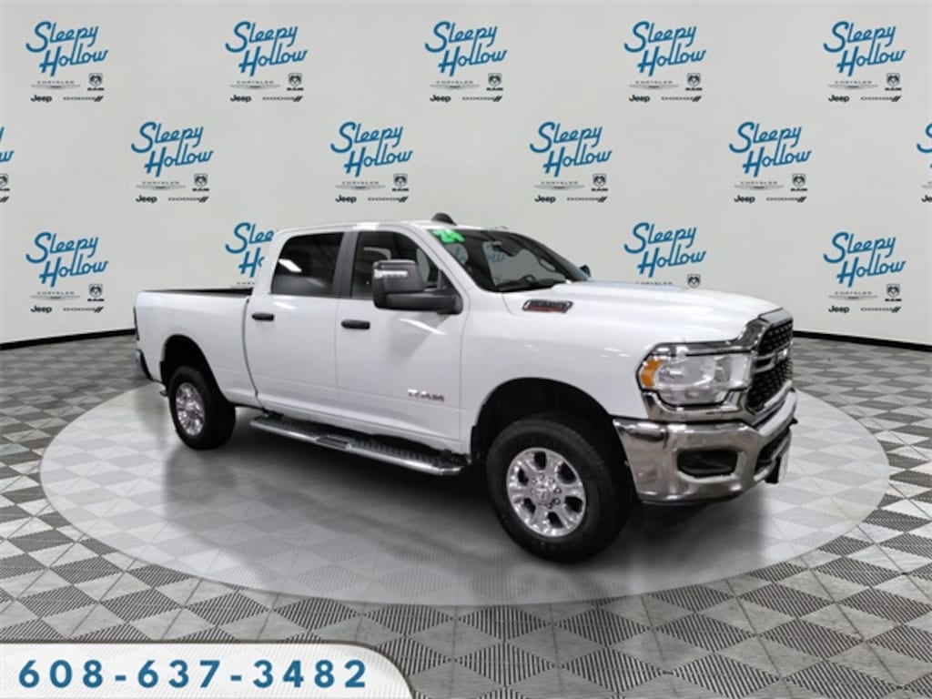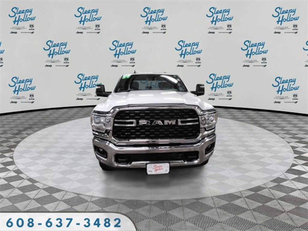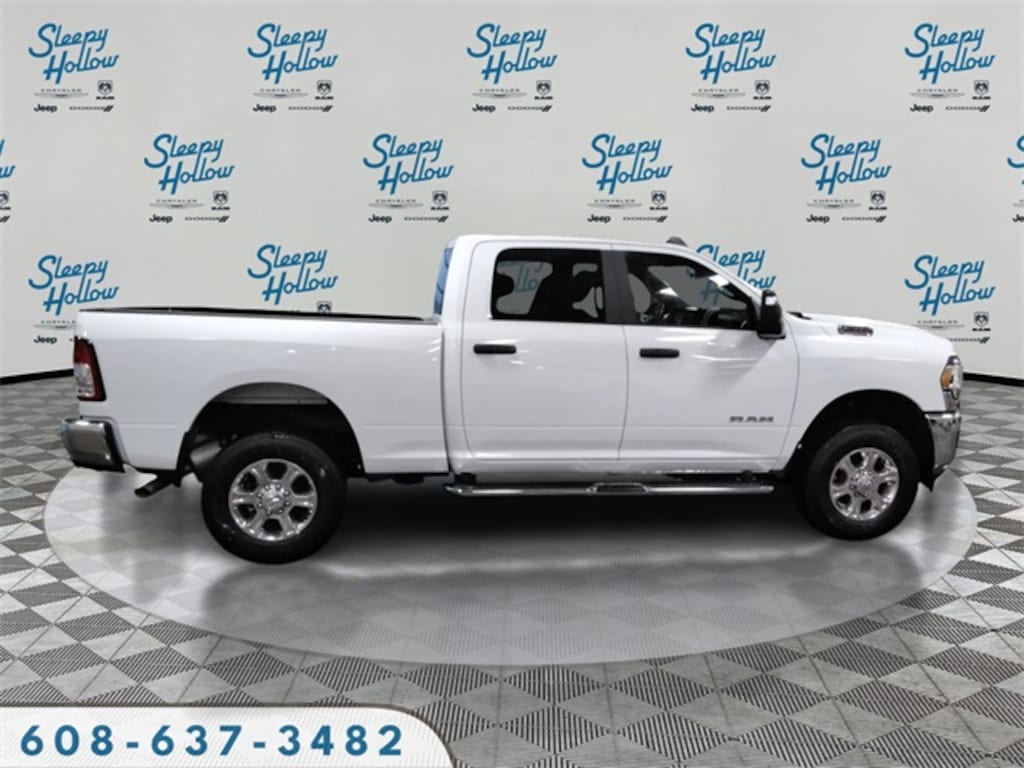 Bright White Clearcoat 2024 Ram 2500 Big Horn 4WD 8-Speed Automatic 6.4L V8 2 Way Rear Headrest Seat, 2nd Row In Floor Storage Bins, 3.73 Axle Ratio, 4 Way Front Headrests, 4-Wheel Disc Brakes, 40/20/40 Split Bench Seat, 4G LTE Wi-Fi Hot Spot, 6 Speakers, 8.4" Touchscreen Display, 9 Alpine Speakers w/Subwoofer, ABS brakes, Active Noise Control System, Air Conditioning, Anti-Spin Differential Rear Axle, Apple CarPlay, Auto Power-Folding Mirrors, Bed Utility Group, Big Horn IP Badge, Black Exterior Mirrors, Bluetooth Handsfree Phone & Audio, Brake assist, Bumpers: chrome, Center Hub, Center Stack Storage Drawer, Chrome Flat Cab-Length Side Steps, Cloth 40/20/40 Bench Seat, Compass, Connectivity - US/Canada, Delay-off headlights, Driver door bin, Dual front impact airbags, Dual front side impact airbags, Dual Glove Boxes, Electronic Stability Control, Electronically Controlled Throttle, Emergency communication system: SiriusXM Guardian, Exterior Mirrors Courtesy Lamps, Exterior Mirrors w/Heating Element, Exterior Mirrors w/Supplemental Signals, Foam Bottle Insert (Door Trim Panel), Footwell Courtesy Lamp, For Details, Visit DriveUconnect.com, For More Info, Call 800-643-2112, Forward & Reverse Utility Lights, Front anti-roll bar, Front Armrest w/Cupholders, Front Center Armrest w/Storage, Front Center Seat Cushion Storage, Front Fog Lamps, Front License Plate Bracket, Front reading lights, Front Seat Back Map Pockets, Fully automatic headlights, Global Telematics Box Module (TBM), Glove Box Lamp, Google Android Auto, GPS Antenna Input, Heated door mirrors, Illuminated entry, Integrated Center Stack Radio, Integrated Voice Command w/Bluetooth, Leather Wrapped Steering Wheel, LED Bed Lighting, Level 1 Equipment Group, Locking Lower Glove Box, Low tire pressure warning, Manual Adjust 4-Way Driver Seat, Manual Adjust 4-Way Front Passenger Seat, Manufacturer's Statement of Origin, Mirror Running Lights, MOPAR Deployable Bed Step, MOPAR Spray In Bedliner, Occupant sensing airbag, Outside temperature display, Overhead airbag, Overhead console, Panic alarm, ParkView Rear Back-Up Camera, Passenger door bin, Passenger vanity mirror, Power 2-Way Driver Lumbar Adjust, Power Adjust 8-Way Driver Seat, Power Adjust Mirrors, Power Adjustable Convex Aux Mirrors, Power door mirrors, Power Heated Fold Telescope Mirrors, Power steering, Power Telescoping Mirrors, Power windows, Premium Cloth 40/20/40 Bench Seat (DISC), Protection Group, Quick Order Package 2GZ Big Horn, Radio data system, Radio: Uconnect 3 w/5" Display, Radio: Uconnect 5 W w/8.4" Display, Rear 60/40 Folding Seat, Rear anti-roll bar, Rear Dome w/On/Off Switch Lamp, Rear Folding Seat, Rear seat center armrest, Rear step bumper, Remote keyless entry, Remote USB Port - Charge Only, Selectable Tire Fill Alert, SiriusXM Radio Service, SiriusXM Satellite Radio, Speed control, Steering Wheel Mounted Audio Controls, Storage Tray, Tachometer, Tilt steering wheel, Tip Start, Tow Hooks, Traction control, Trip computer, Turn signal indicator mirrors, Variably intermittent wipers, Voltmeter, Wheels: 18" x 8.0" Polished Aluminum, Wheels: 18" x 8.0" Steel Chrome Clad.
