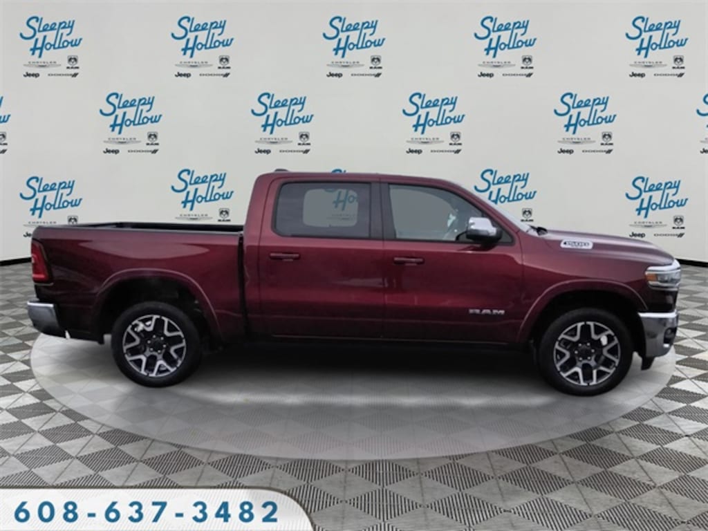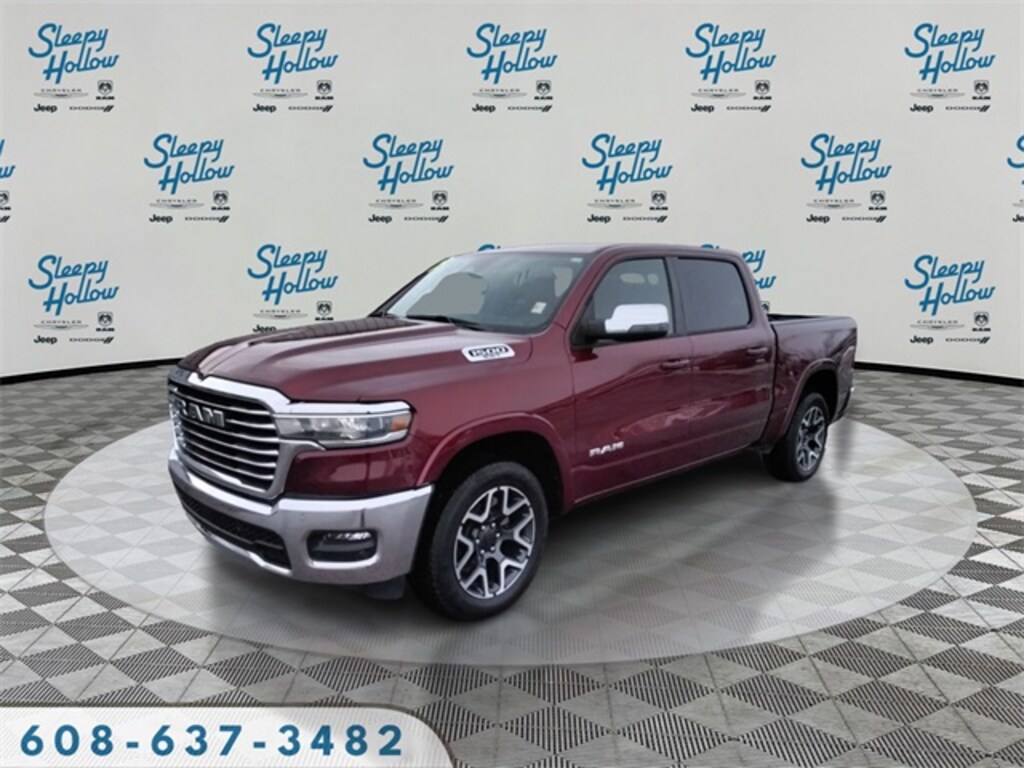 Delmonico Red Pearlcoat 2025 Ram 1500 Laramie 4WD 8-Speed Automatic 3.0L I6 10 Speakers, 3 Rear Seat Head Restraints, 3.55 Rear Axle Ratio, 4 Way Front Headrests, 4-Wheel Disc Brakes, 4G LTE Wi-Fi Hot Spot, ABS brakes, Air Conditioning, Alloy wheels, AM/FM radio: SiriusXM with 360L, Apple CarPlay, Apple CarPlay/Android Auto, Audio memory, Auto High-beam Headlights, Auto Power-Folding Mirrors, Auto-dimming door mirrors, Auto-Dimming Exterior Driver Mirror, Auto-dimming Rear-View mirror, Automatic temperature control, Brake assist, Bumpers: chrome, Chrome Exterior Mirrors, Compass, Connected Travel & Traffic Services, Connectivity - US/Canada, Convex Wide-Angle Exterior Mirror Insert, Delay-off headlights, Driver door bin, Driver Seat Memory, Driver vanity mirror, Dual front impact airbags, Dual front side impact airbags, Electronic Stability Control, Exterior Mirrors Courtesy Lamps, Exterior Mirrors w/Heating Element, Exterior Mirrors w/Memory, Exterior Mirrors w/Supplemental Signals, Front anti-roll bar, Front Center Armrest w/Storage, Front dual zone A/C, Front fog lights, Front License Plate Bracket, Front reading lights, Front Seat Back Map Pockets, Front wheel independent suspension, Fully automatic headlights, Garage door transmitter, Google Android Auto, GPS Antenna Input, GPS Navigation, HD Radio, Heated door mirrors, Heated Front Seats, Heated front seats, Heated rear seats, Heated Steering Wheel, Heated steering wheel, Illuminated entry, Integrated Voice Command w/Bluetooth, Laramie Level 1 Equipment Group, Leather steering wheel, Leather Trim 40/20/40 Bench Seat, Low tire pressure warning, Manufacturer's Statement of Origin, Memory seat, Navigation System, Occupant sensing airbag, Outside temperature display, Overhead airbag, Overhead console, Panic alarm, ParkView Rear Back-Up Camera, Passenger door bin, Passenger vanity mirror, Power 2-Way Driver Lumbar Adjust, Power 2-Way Passenger Lumbar Adjust, Power Adjust 8-Way Front Passenger Seat, Power door mirrors, Power driver seat, Power passenger seat, Power steering, Power windows, Quick Order Package 21H Laramie, Radio data system, Radio: Uconnect 5 Nav w/12.0" Display, Rain Sensitive Windshield Wipers, RAM Grille Badge - Chrome, Rear anti-roll bar, Rear reading lights, Rear seat center armrest, Rear step bumper, Remote keyless entry, Remote Tailgate Release, Security system, SiriusXM w/360L, Speed control, Split folding rear seat, Steering wheel mounted audio controls, Tachometer, Telescoping steering wheel, Tilt steering wheel, Traction control, Trip computer, Turn signal indicator mirrors, USB Host Flip, Variably intermittent wipers, Ventilated Front Seats, Ventilated front seats, Voltmeter, Wheels: 20" x 9" Premium Paint/Polish.
